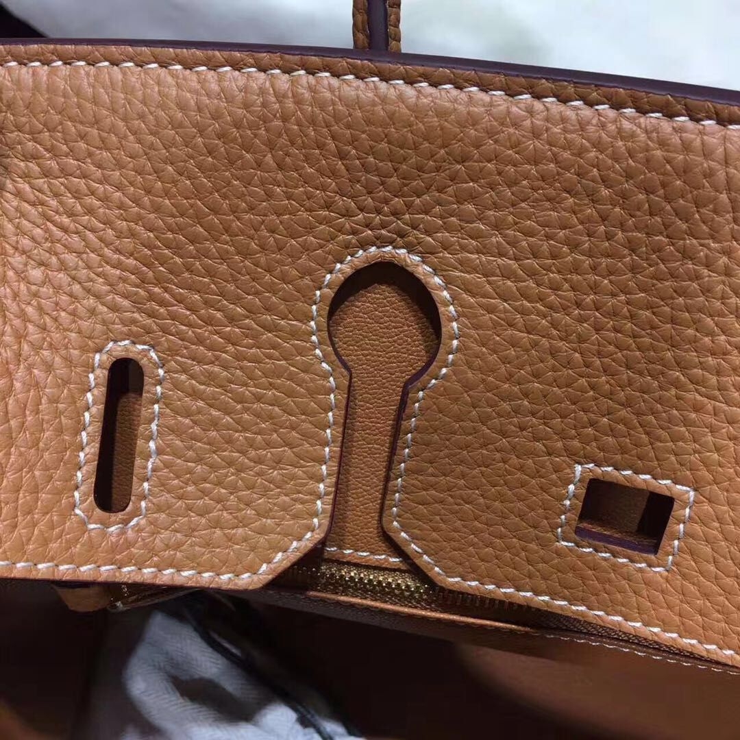 Ez a Hermès Birkin 35 cm-es marhabőr erekből készült, világos kávé ezüst színű kézitáska a következőket tartalmazza: Hermès zár, kulcsok, zárbetét, talpbetét, ápolási füzet, esővédő, címkék és egy hivatalos Hermès üzletből származó eredeti blokk másolata.
